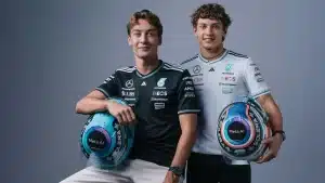 Visibilidade da marca Meta AI nos capacetes dos pilotos da equipe – incluindo George Russell e Kimi Antonelli. Mercedes-AMG PETRONAS F1 Team+1